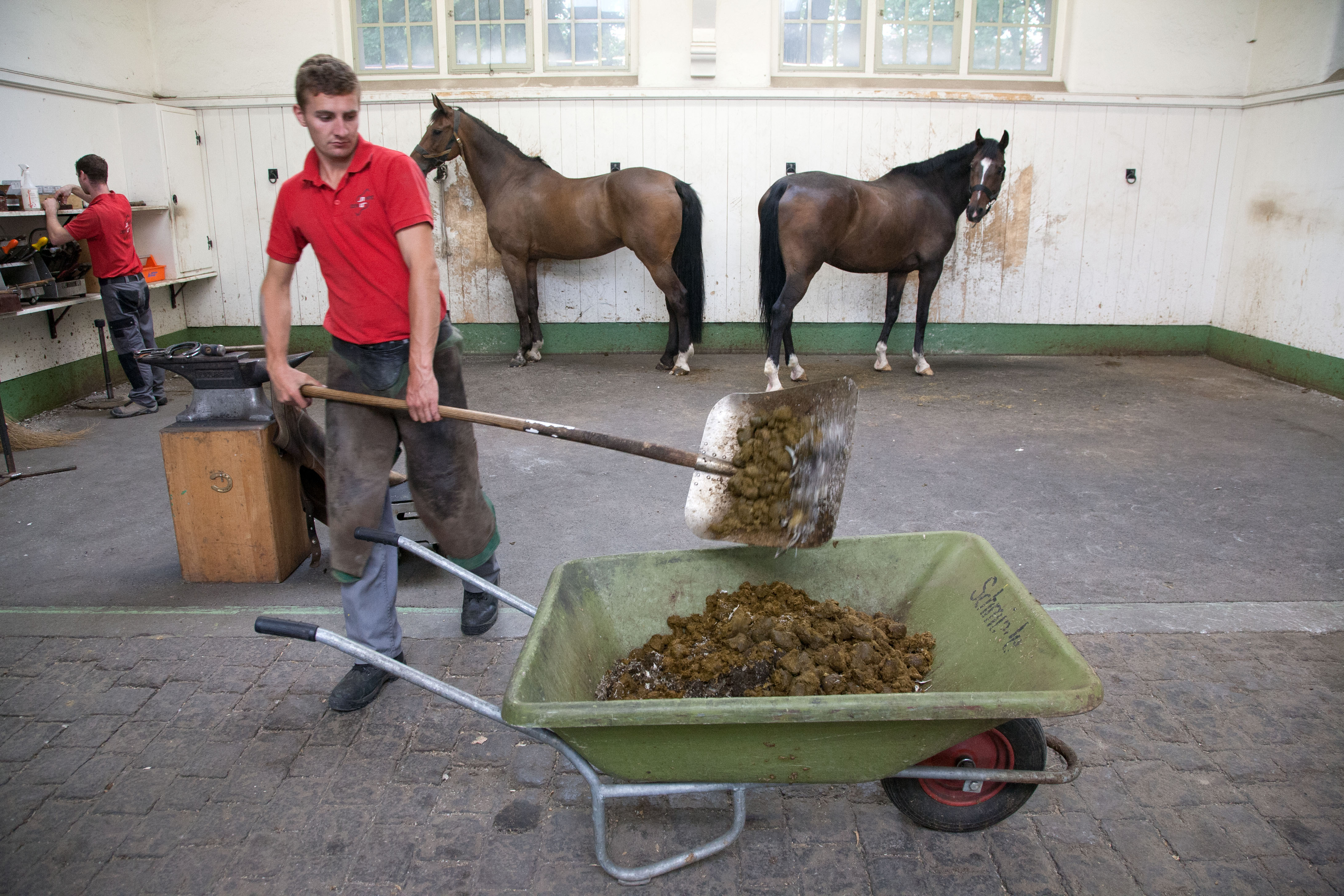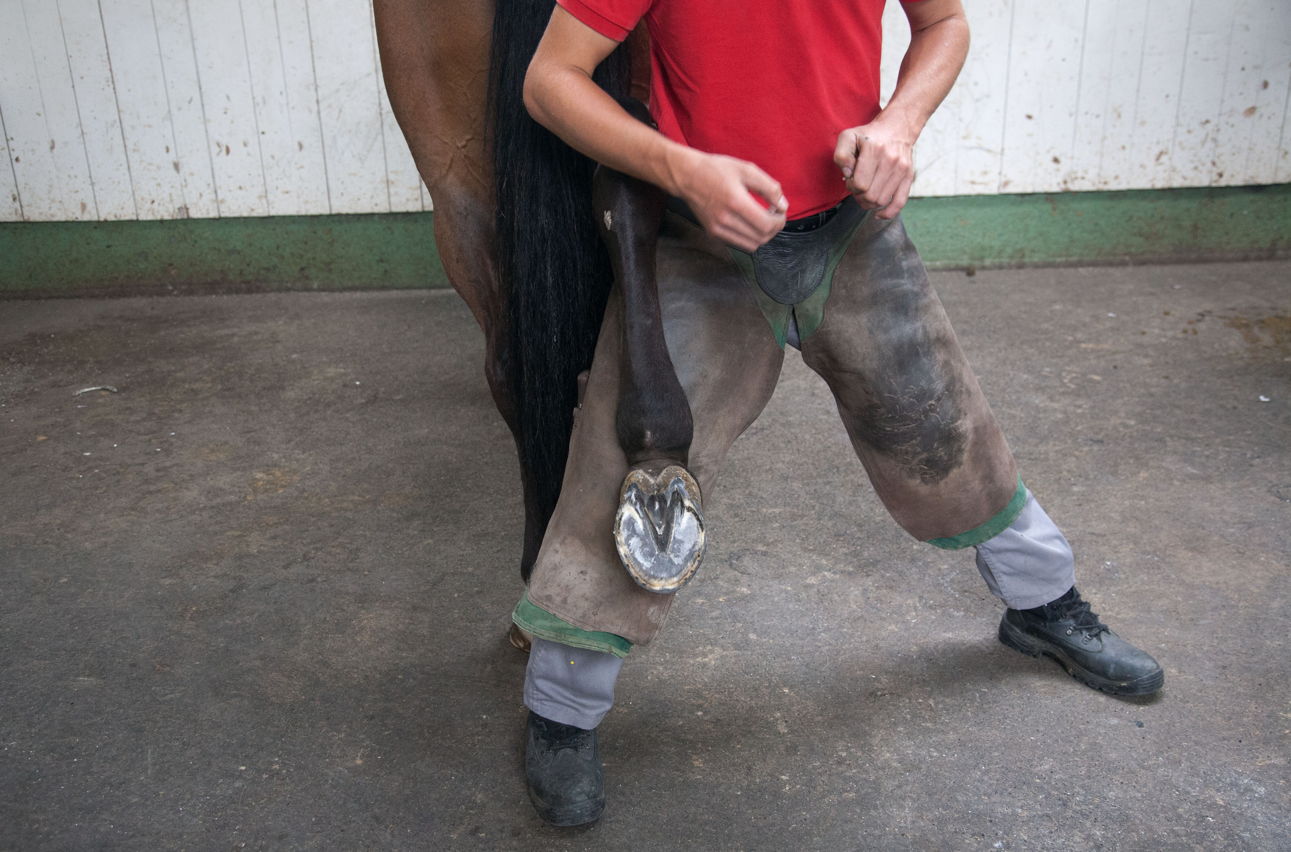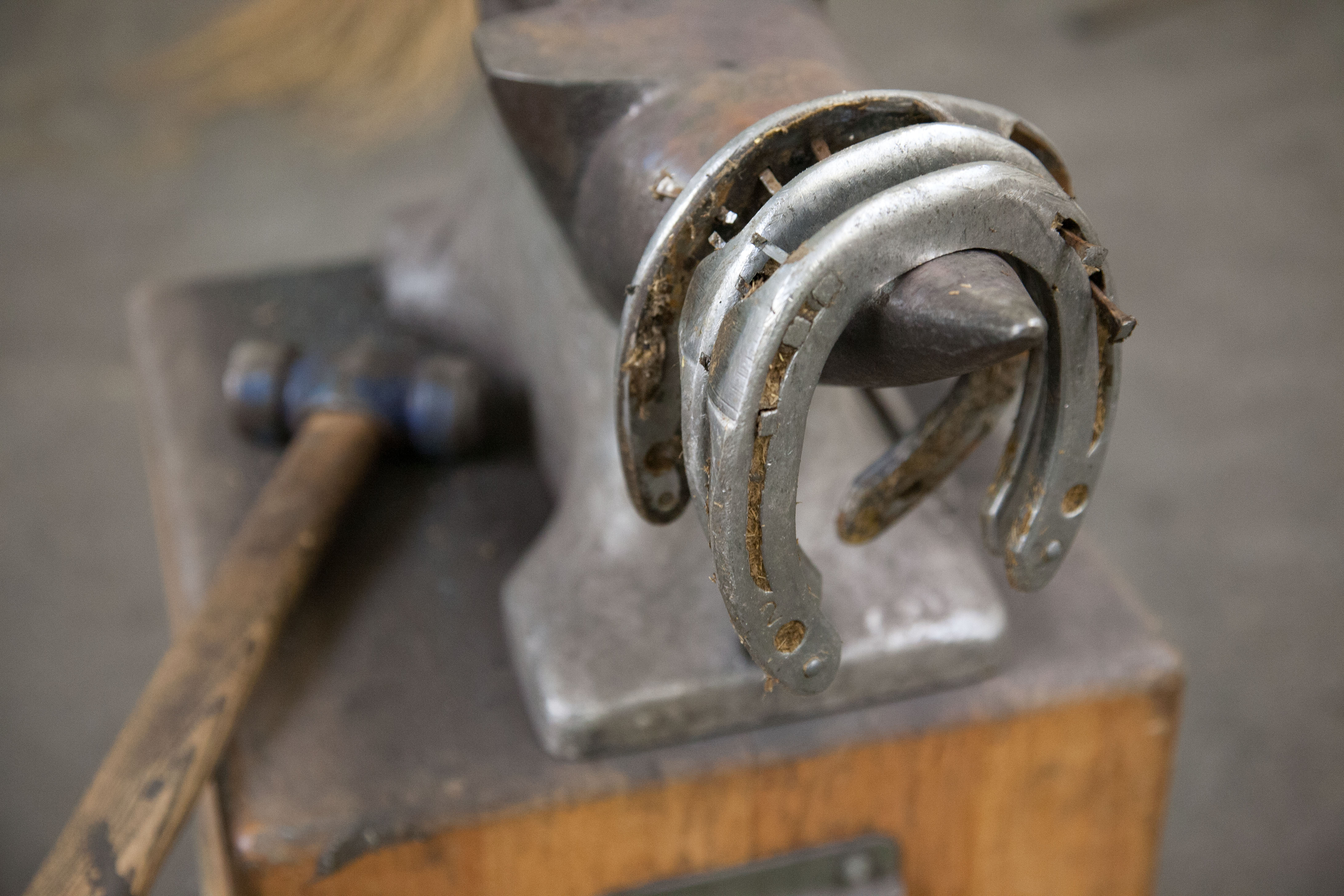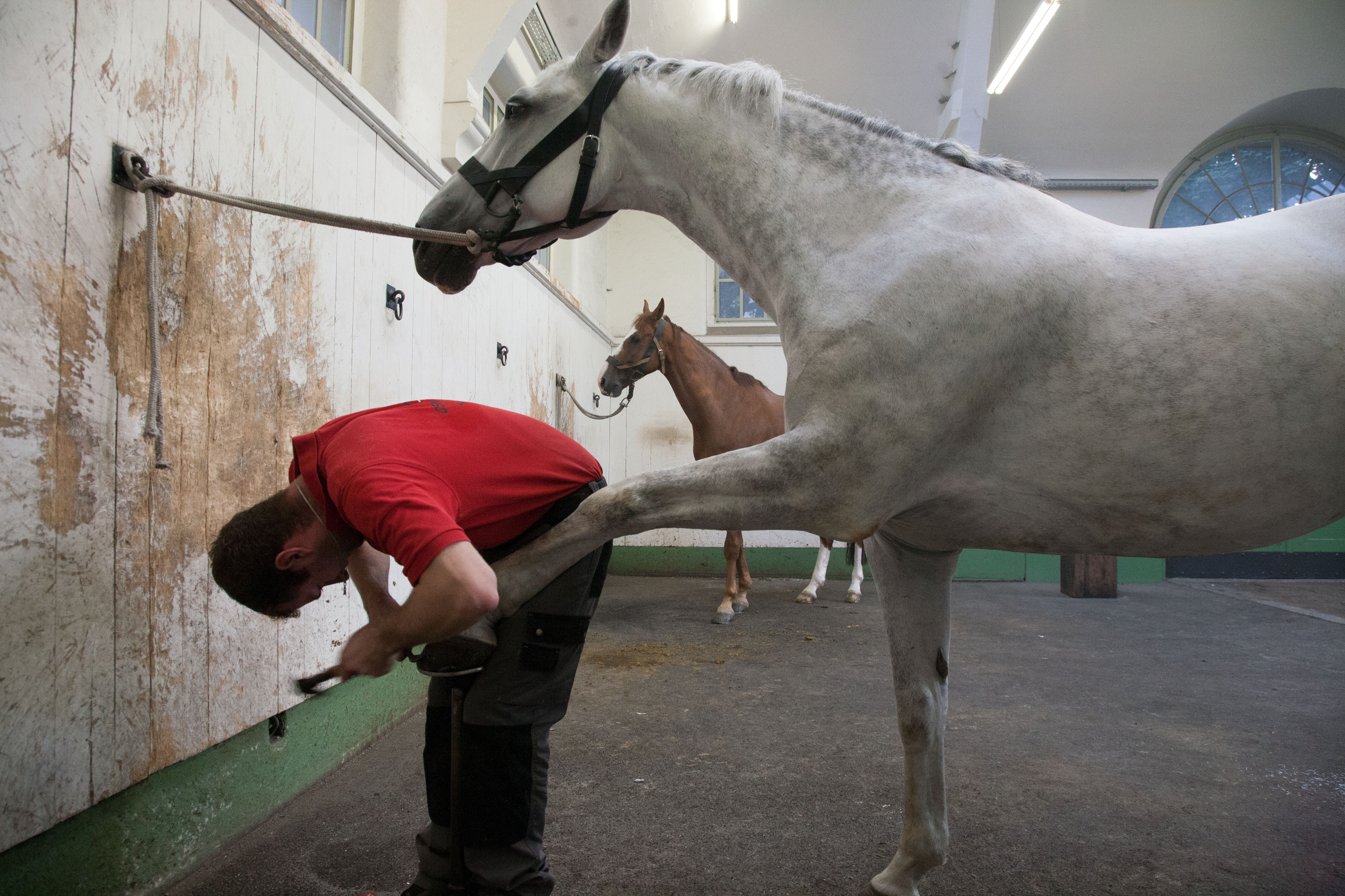 国立馬事センターは、連邦軍厩舎(きゅうしゃ)が閉鎖されたことをきっかけに、1997年に創設された。現在、厩舎で飼われている馬は約200頭。ここで蹄鉄を打たれるのは同センターの馬だけでなく、軍馬、訓練馬、個人所有の馬、動物病院で治療を受けている馬など様々。蹄鉄には、工業製品以外にも、手作りのものが使用される。(写真:クリストフ・バルジガー、swissinfo.ch、文:ベルン国立馬事センター)