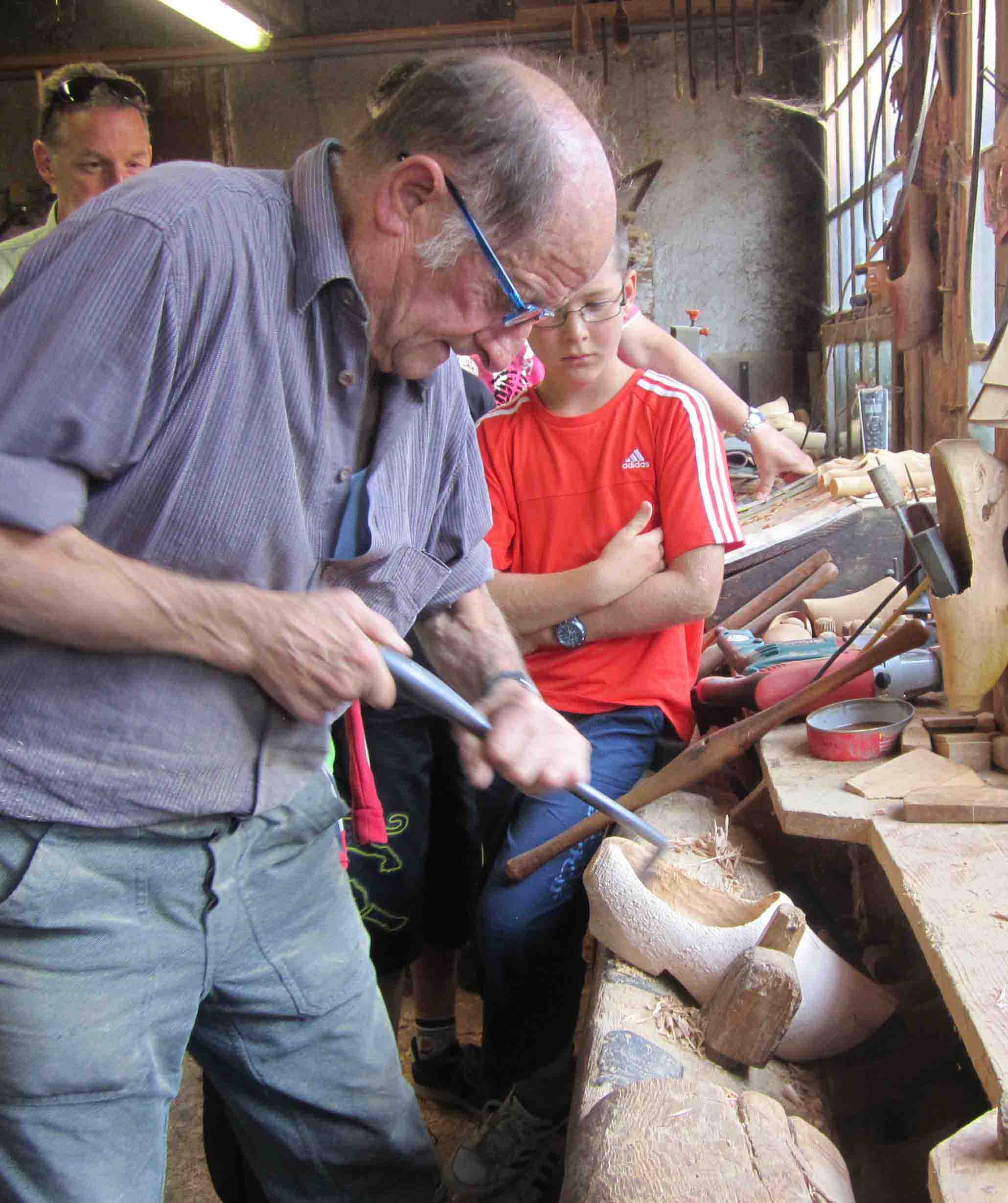 撮影後はロンデさんの口利きで、同じ村に住む木靴職人、アンドレ・ゲニャ(André Gaignat)さんの工房にお邪魔することができた。彼はスイスでたった1人になってしまった現役の木靴製造者で、スイスフランス語圏の国営テレビにも出演したことがある。一見、気難しそうに見えるアンドレさんだが、私達の目的を知ると、花壇に使う巨大木靴を引っ張り出してきてセットし、工具を持って自らポーズを決めてくれた。左リンクのテレビ番組内でも紹介されているが、現在、娘さんが継承者として修業中である。