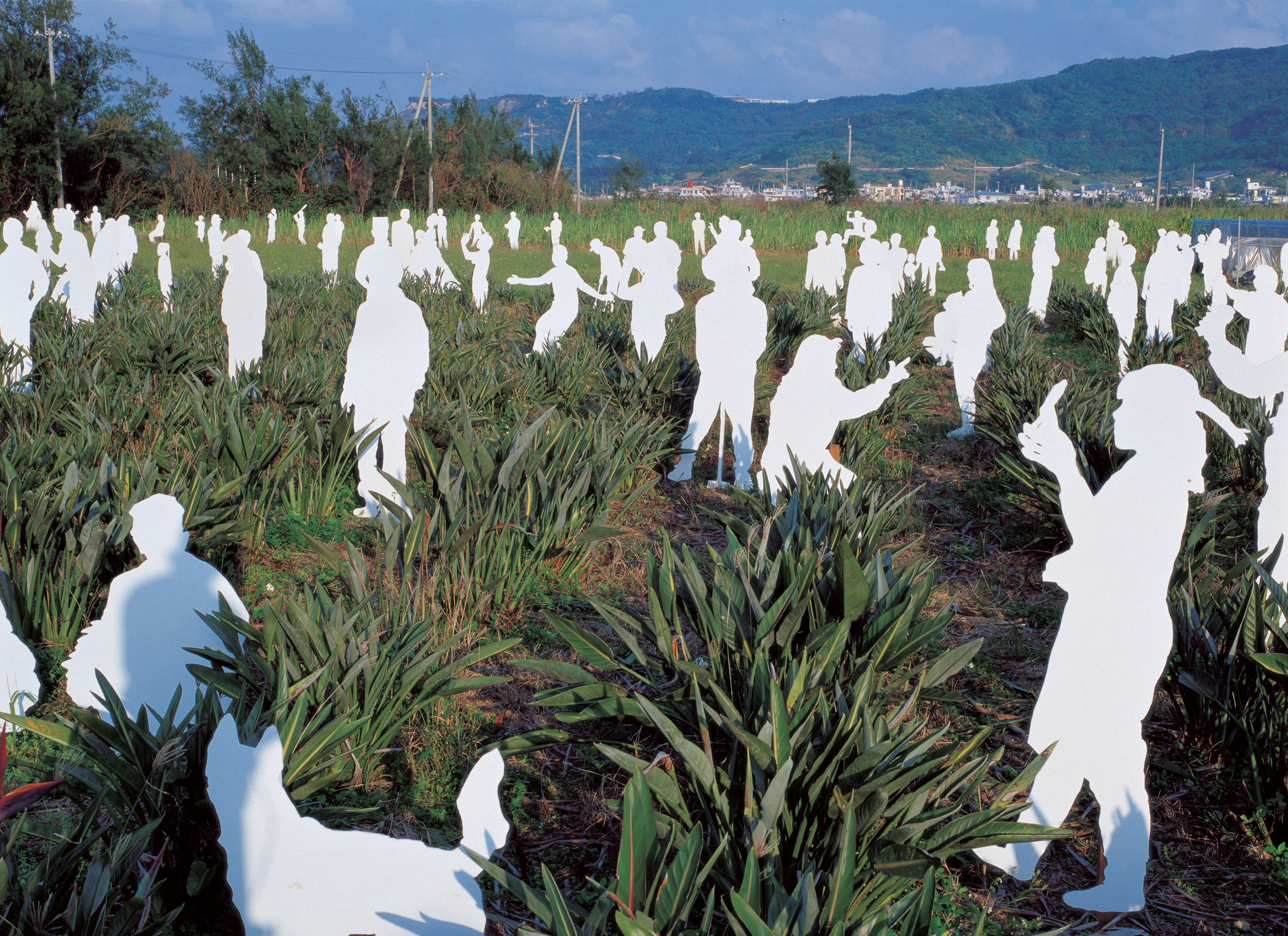 仲本先生の「人看板計画」については上記ブログでお話したが、もう一度かいつまんで述べる。まず、1人もしくは複数の人間の全身を、できれば職業や得意分野が分かる格好で撮影する。そしてその写真をスクリーン上に等身大で投影し、木の板で型取りして白く塗る。こうしてできた「人看板」をその地方のどこかに展示するのだが、沖縄では収穫が終わった花畑一面に200体「植えた」そうだ。