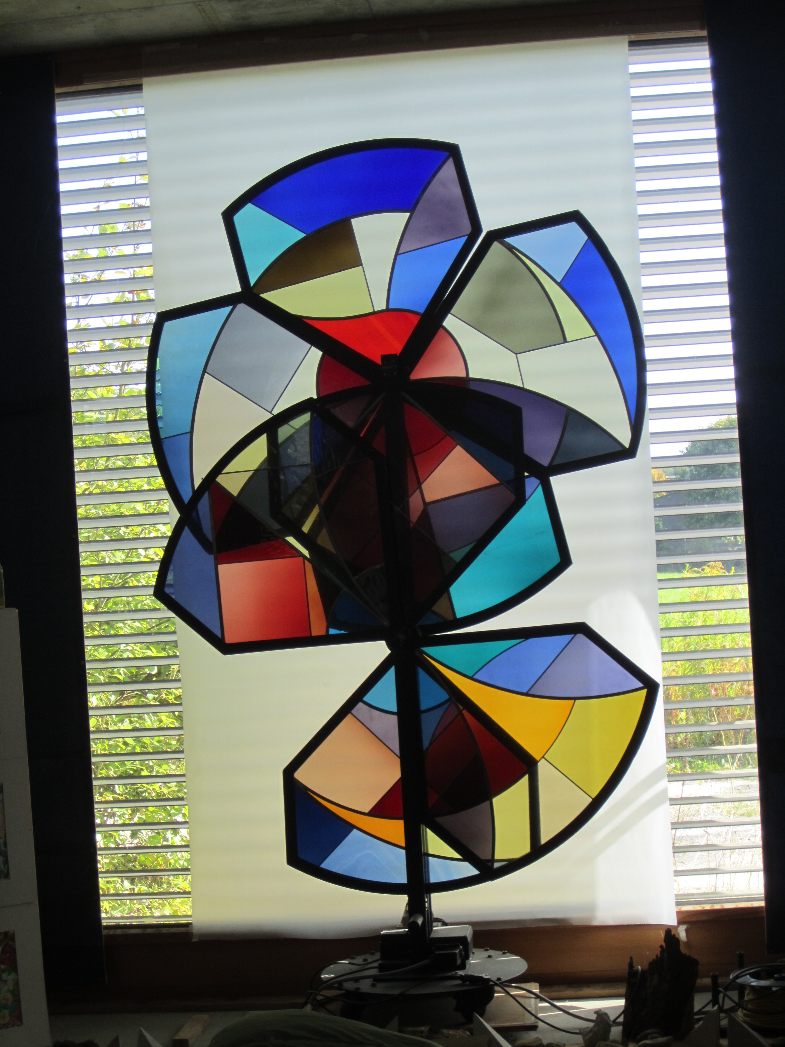 その後訪れたルカスさんのアトリエは、パップさんの家から100メートルほど先にあった。ジュラの農村では珍しく、コンクリート打ちっぱなしの壁で平屋根、いかにも芸術家の邸宅という感じである。彼は今年80歳を迎え、画家人生の集大成とも言える「80歳のルカス・デュブリン」を発表、その記念パーティを行うための準備中だった。巨大なアトリエの壁という壁には隙間のないほど作品が飾られ、生涯を通しての創作意欲の豊かさが窺えた。ステンドグラス職人でもあるルカスさん独特の絵画手法の一つに、幾何学模様での景色や生物の描写がある。幾何学というと何となく堅苦しい感じだが、淡い色彩のせいか、見るものの想像力を楽しく搔き立ててくれる。サービス精神旺盛なルカスさんは、「いかにも画家らしい」格好にこだわり、ベレー帽やダブダブの白衣をわざわざ身に着け、古びたパレットと絵筆を持って撮影に応じてくれた。