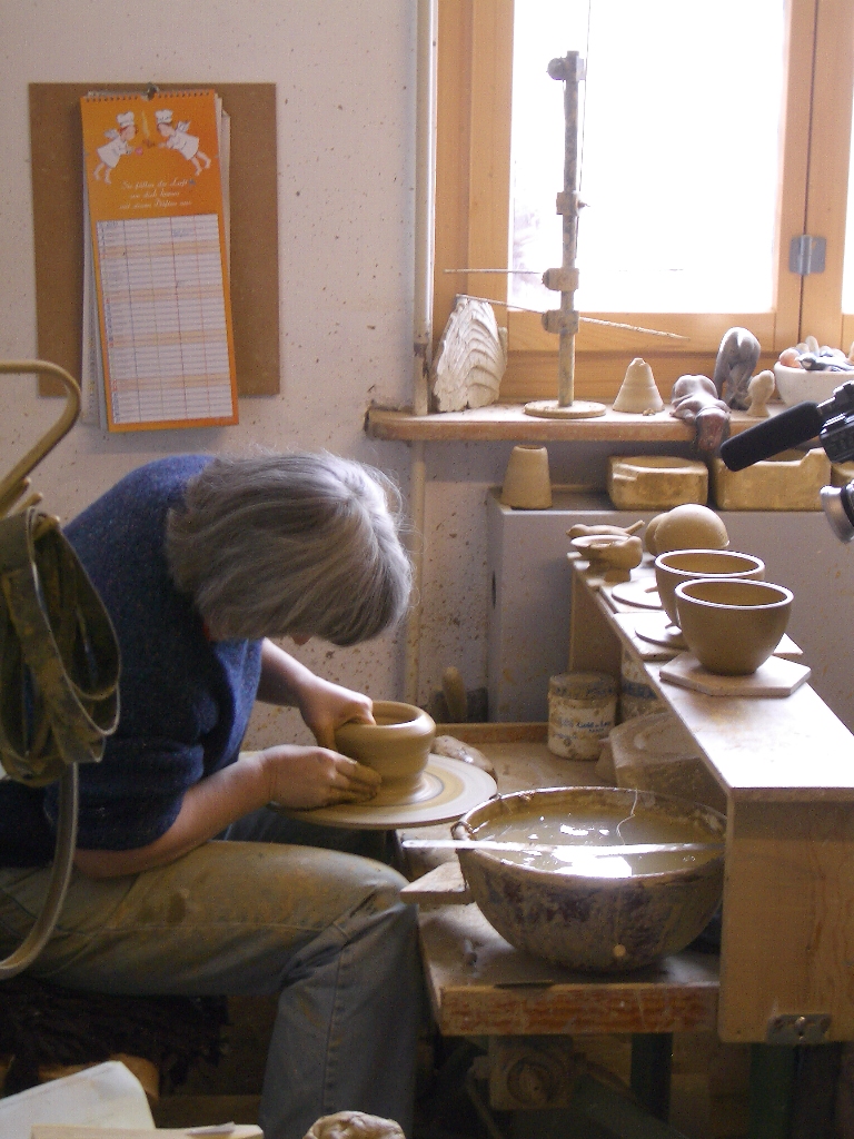 前出のダニエルの出身村ボンフォルにはフェリシタス・ホルツガング(Felicitas Holzgang)さんという名の陶芸家が住んでいる。彼女は中央スイス・シュヴィーツ州出身で、ベルンの芸術学校を終えた後、ジュラの陶芸家に師事した。現在では唯一のボンフォル伝統陶芸継承者として村内にアトリエを構え、村の陶芸博物館の館長も務めている。以前、私は取材でお邪魔したことがあり、大変お世話になった。仲本先生もスイスに来る度に彼女のアトリエを訪れ、親交を深めている。今回、彼女が私達一行を温かく迎え、撮影に協力してくれたことは言うまでもない。少しでも多くの個性的な被写体を探していると話すと、同じ村に住む、ある画家のところに行くとよいと勧めてくれた。その時、本人がふらりと現れたことで全員が驚いた。画家の名前はルカス・デュブリン(Lukas Düblin)さん。スイス・ドイツ語圏出身同士ということでフェリシタスさんとは長年の良き友である。彼女の説明に、ルカスさんもまた撮影参加を快く引き受けてくれた。