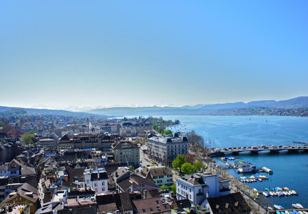 グロスミュンスターの塔からの街の眺め。くっきりとした壮大なアルプスを街から眺めたい場合、澄みきった空気の冬から春先の晴れの日がおススメ! swissinfo.ch