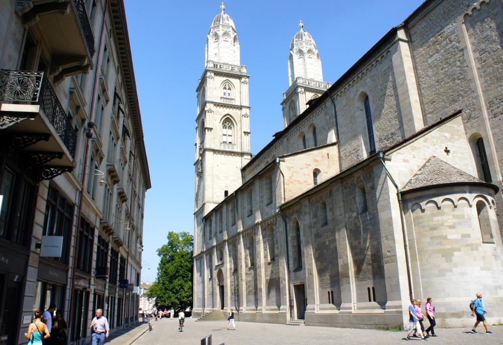 ミュンスター橋(Münsterbrücke)を渡って対岸へ、グロスミュンスターの方角へと向かった。チューリヒの旧市街だ。グロスミュンスターは2つの塔を持つロマネスク様式の大聖堂で、街のランドマーク的な存在だ。ここまで辿り着いたら、時間に余裕のある健脚者には、是非塔の上まで歩いて登っていただきたい。2塔のうちの一つ、「カールス塔(Grossmunster Karlsturm)」が一般向けに有料(4フラン)で開放されており、塔の上からは360度の大パノラマで、町全体を眺める事が出来る。空気の澄んだ天気のよい日(特に午前中)には、チューリヒ湖の向こうの遥か彼方に雄大なアルプスの山々を見渡せる。