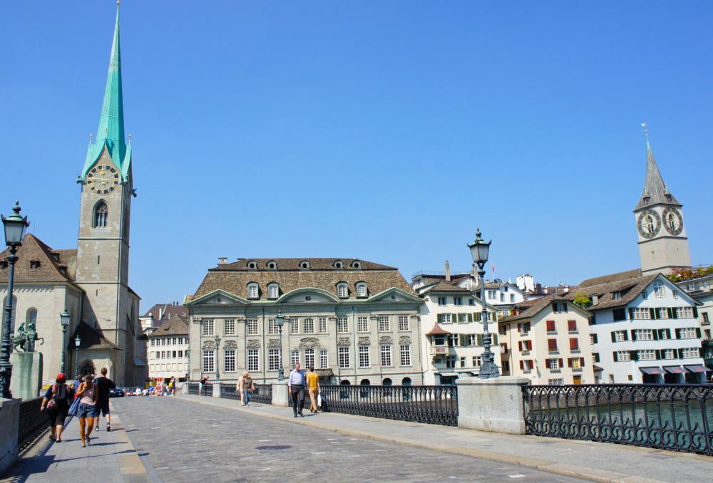 バーンホフシュトラッセから川の向こう側ベルビューまで歩いた後は、クヴァイ橋の上からリマト川と3つの教会、チュ―リヒの街を見渡す swissinfo.ch