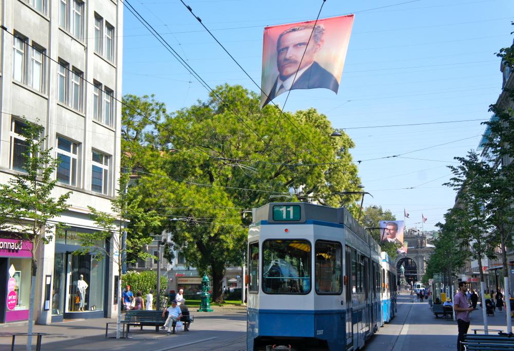 チューリヒの街の見どころはいくつもあるのだが、最初はサマーフェスティバルの期間中(2015年6月25日〜9月6日まで)に屋外で展示されるアートを見物する事にした。まずは中央駅(HB)から、作品が展示されているショッピングストリートであるバーンホフシュトラッセを散策する。通常はスイスの国旗とチューリヒ州の旗が掲げられている大通りは、現在、チューリヒの歴史的著名人達を描いた肖像画の旗が翻っている。これらは「Historic Faces」と名付けられたアート作品の一部である。バーンホフシュトラッセを中心に、その他のアートも展示されている。