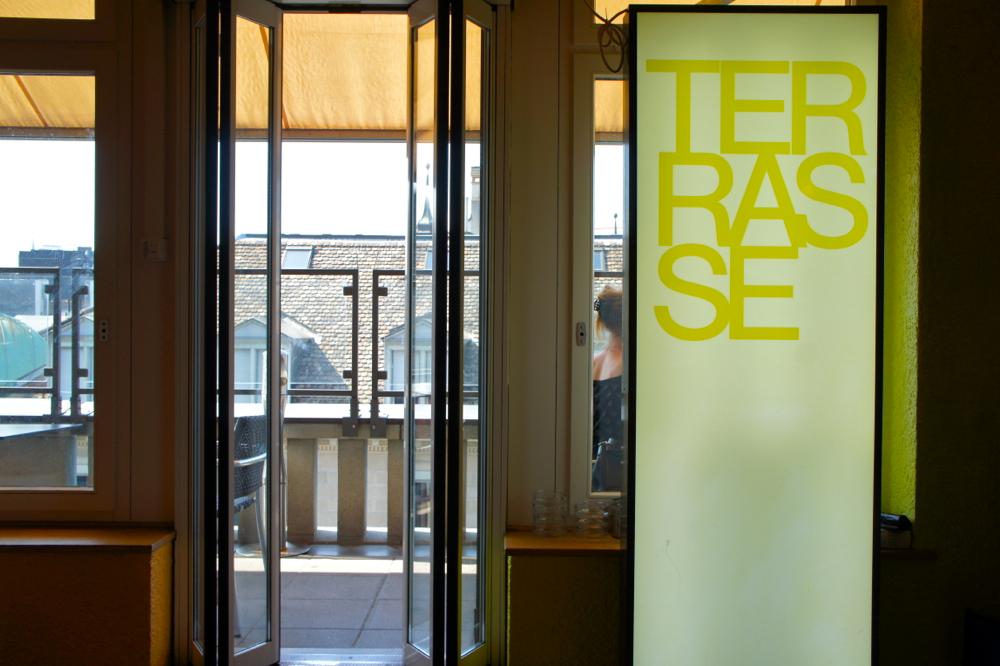 夏の日はテラス席でランチ!デパートMANORの食堂では、セルフサービスで好きなものを購入し、人々は好みの席に腰掛けて、憩いの時間を過ごす swissinfo.ch