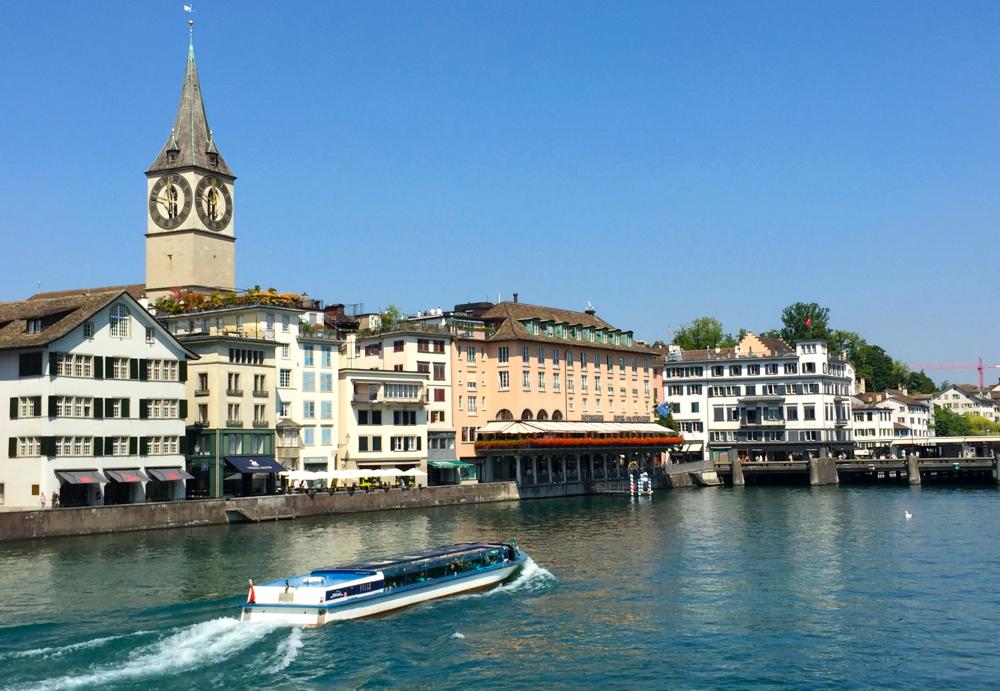 いくつもある細い通りをリマト川が流れる方角へと抜けると、川沿いの散歩道へ。カメラを持った観光客や、地元の人たちも歩いている小径からは聖母教会(フラウミュンスター Fraumünster)や聖ペーター教会、対岸のグロスミュンスター(大聖堂 Grossmünster)等が目の前に広がる。途中、リマト川にかかる橋の上で立ち止まって、美しい街の風景を眺めてみる。春から夏の間にだけ運行されるガラス張りの水上バスが川を行く。水は太陽の陽射しを受け、青と深い緑色に輝き、眩しいくらいに綺麗だ。教会や橋、歴史的建造物などが並ぶ川沿いの道は、絶好の写真撮影スポット!リマト川の周りのレストランやカフェにも、もちろん屋外のテラス席が設けられている。