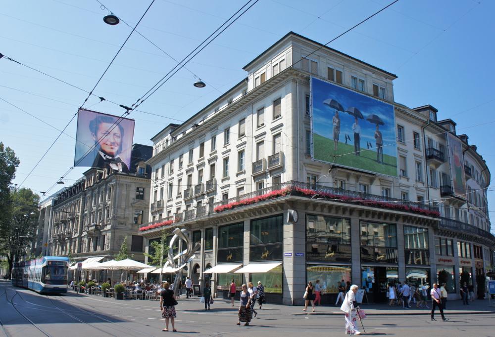 「歩く事を楽しむ」というスイスでの習慣が身に付いた自分にとって、雲一つ無い晴れの日は心もウキウキし、外へ出かけたくなるのだが、気温が高過ぎると、町の散策も熱中症にかからないよう注意が必要だ。7月のある日、水分をこまめに補給しながら快晴のチューリヒの街を歩いてみた。お気に入りの散策コースはバーンホフシュトラッセ(Bahnhofstrasse)から、橋を渡った川向こうのベルビュー(Bellevue)界隈まで。途中、あちらこちらで夏の風景を楽しみながら、街のそぞろ歩きをした。