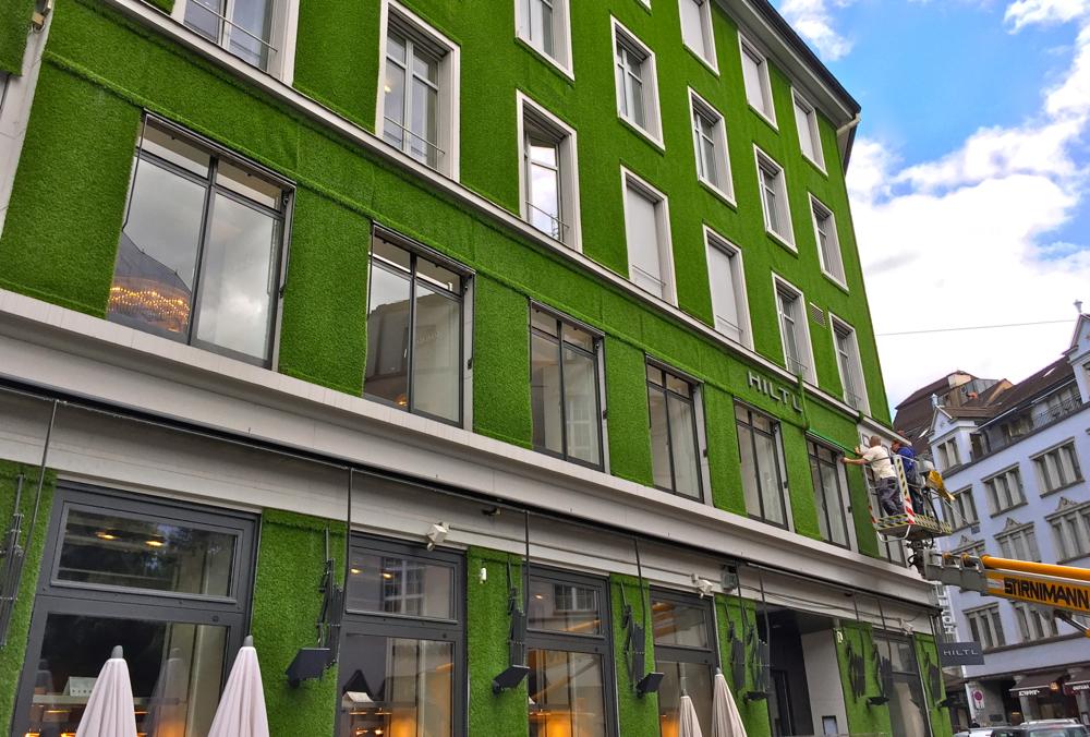 1898年創業、世界最古のベジタリアンレストランとしてギネス記録を持つヒルトゥルが、「Grass façade」と名付けられた作品で、建物全体が緑のアートに大変身! swissinfo.ch