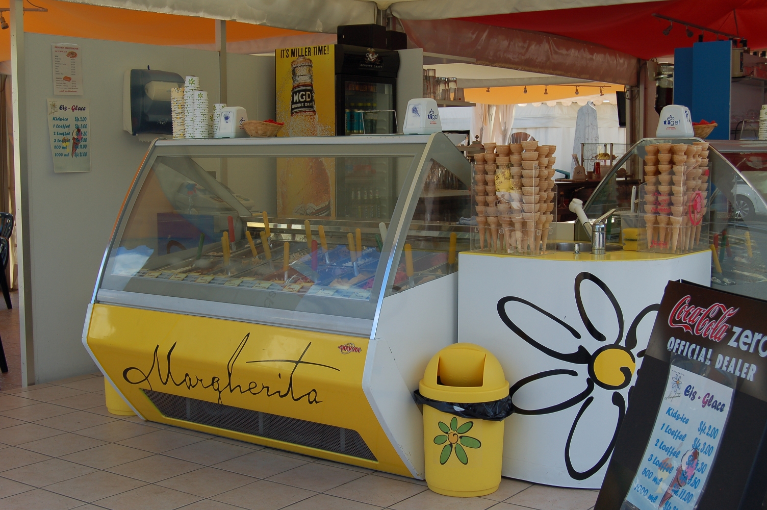 何が快適かというと、休暇に必要なものすべて(いや必要以上かもしれない)が敷地内にすっかり揃っていることだ。湖岸のプライベートビーチはもちろんのこと、ヨットハーバーに公園にテニスコートにサッカー場。さらに、レストランにカフェに売店。ジェラート屋だってある。数え上げたら切りがないが、トイレとシャワーと炊事場しかないのがキャンプ場だと思ったら大間違いだ。