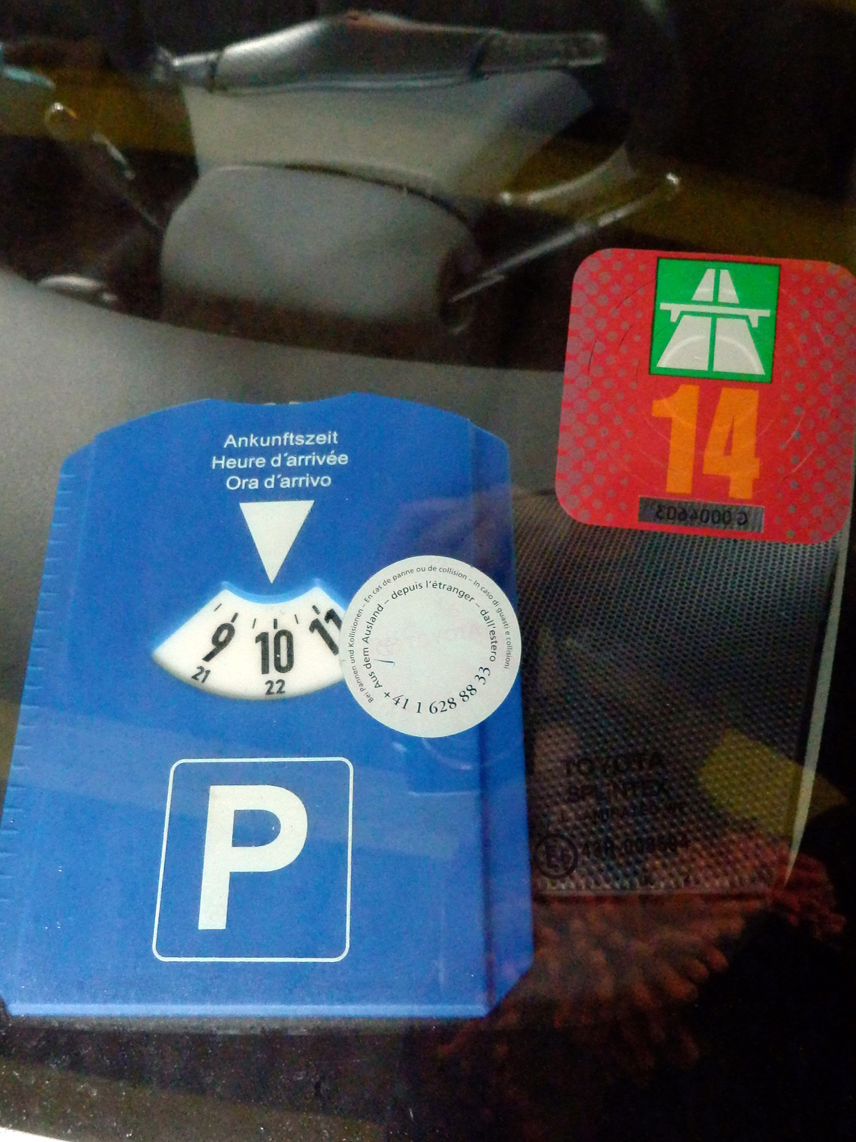 もう一つ、スイスでありがたいと思うのが、パーキング事情だ。東京でどこかに車で出かける時に必ず頭を悩ませるのが、どこに停められるのか、いったいいくらかかるのかという問題だった。スイスでも都市の方が郊外よりも駐車料金が高いのは同じだが、東京ほどではなく、一時間で2フランを超える料金設定にはまだ出会ったことがない。(チューリヒなどの大都市はまだ車で行ったことがないので未確認)。また、青い線で囲まれたブルー・ゾーン(Blaue Zone)には、公式の青い時間表示板(Parkscheibe)を窓に掲示することで平日最高一時間まで無料で駐車することができる。
