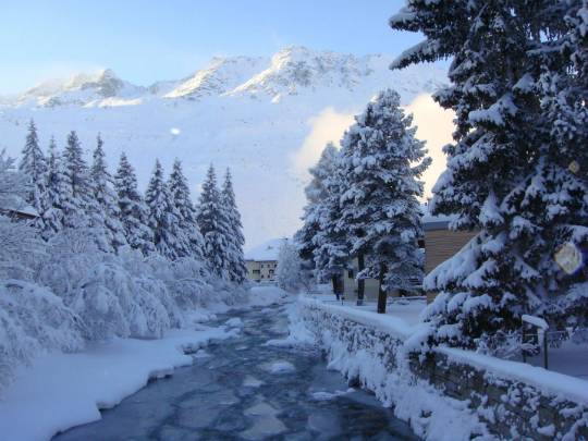 まず移動当日は標高の低い町の中でもマイナス10度を越える寒さだったので、後日スキーを満喫するため無理をせず電車に乗ってアンデルマットまで散策に行くことにしました。日本でも有名な氷河特急の各駅停車に乗り、途中標高2044mのオーバーアルプ峠(Oberalppass)を通過しながら約50分かけて目的地へ。少し遅めのランチをとり、雪と氷で真っ白になった川をみながら町の散策を楽しみました。
