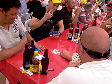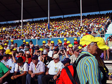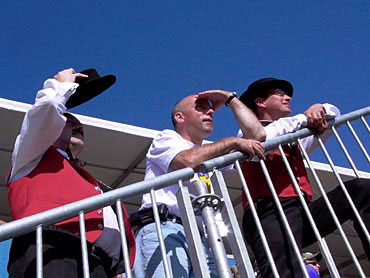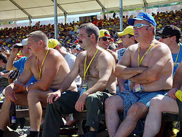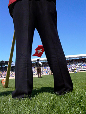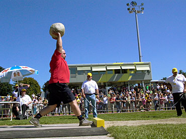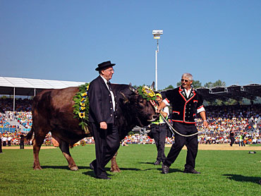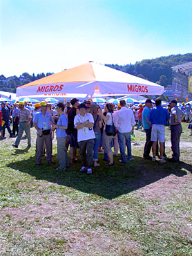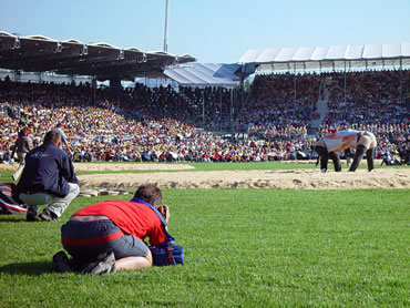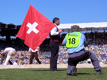 晴天に恵まれた週末。スイスレスリングの腕を競うつわものたち。アーラウ ( Aarau ) で開催されたフォルクローレ一杯の祭には、20万人の観客が訪れた。( 写真 : クリストフ・バルジガー、swissinfo )