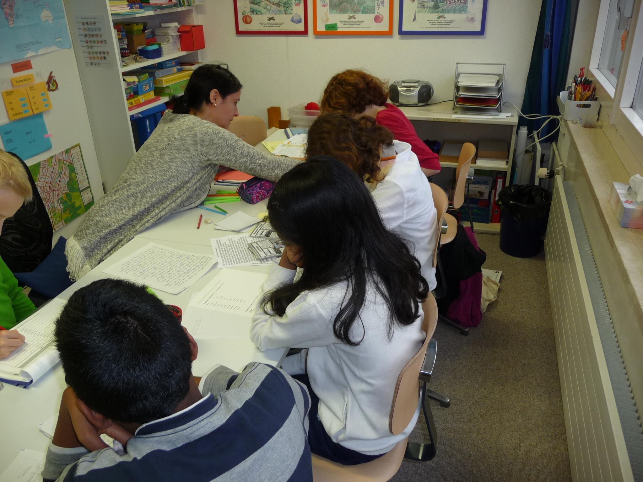 とはいえ、中には5年生でスイスに来た子もいるので、レベルは多岐にわたっている。一人一人にそれぞれ違う課題を与えた上で、先生1人が同時に5人を個別指導することさえある。教室はかなり狭く、先生が他の子に説明する声も耳に入る。そのせいで、気が散ってしまう子もいるのが現状だ。