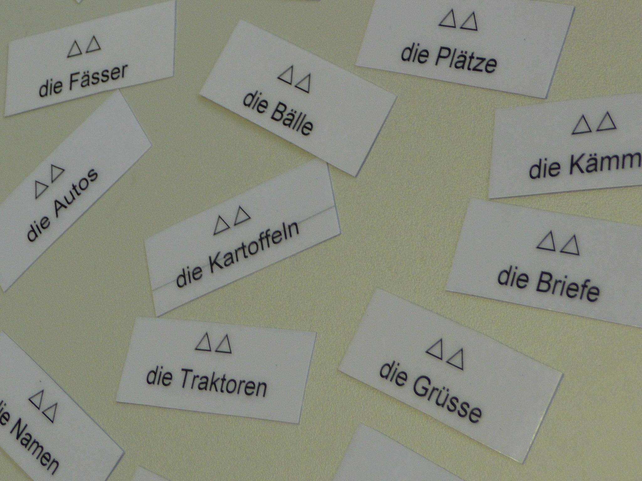 まずは単語カードを、男性・女性・中性名詞に分けていく。すぐに判断できるものもあるが、多くは不規則なので、暗記しなければならない。1人が男性、1人が女性、1人が中性名詞を拾っていき、色別のシートに並べていく。全部そろったら、ひとつひとつ読み上げて確認。Das Brett(板)、Das Fell(毛皮)などを先生が説明、子どもに説明させることも。先生は自然なスピードで話すが、子どもたちはしっかり聞き取っている様子。