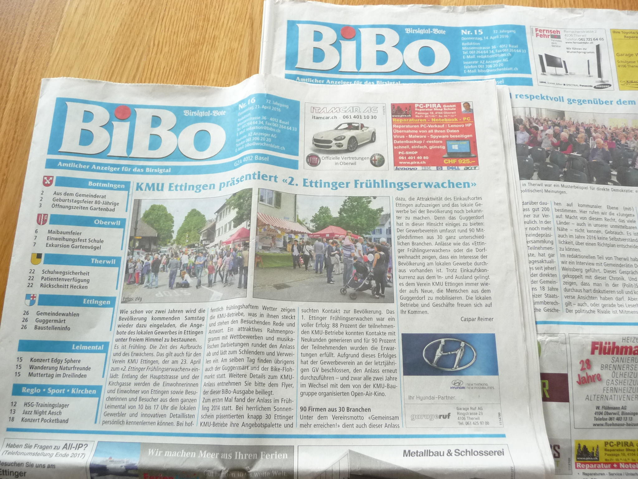 「ビボ(BiBo)」とは、Birsigtal-Bote(ビルジック谷のお知らせ)の略。ビルジックはバーゼルの南を流れる、全長20キロほどの小川だ。そのビルジックの川沿いは、ビルジックの谷と呼ばれるバーゼルのベッドタウン。ここにある四つの自治体が、ビボでそれぞれ3ページずつ広報を展開している。つまり、この辺一帯の地域情報をビボが一手に引き受けているというわけ(ちなみに紙面では、この地域のことを「ビボランド」と呼ぶ!)。