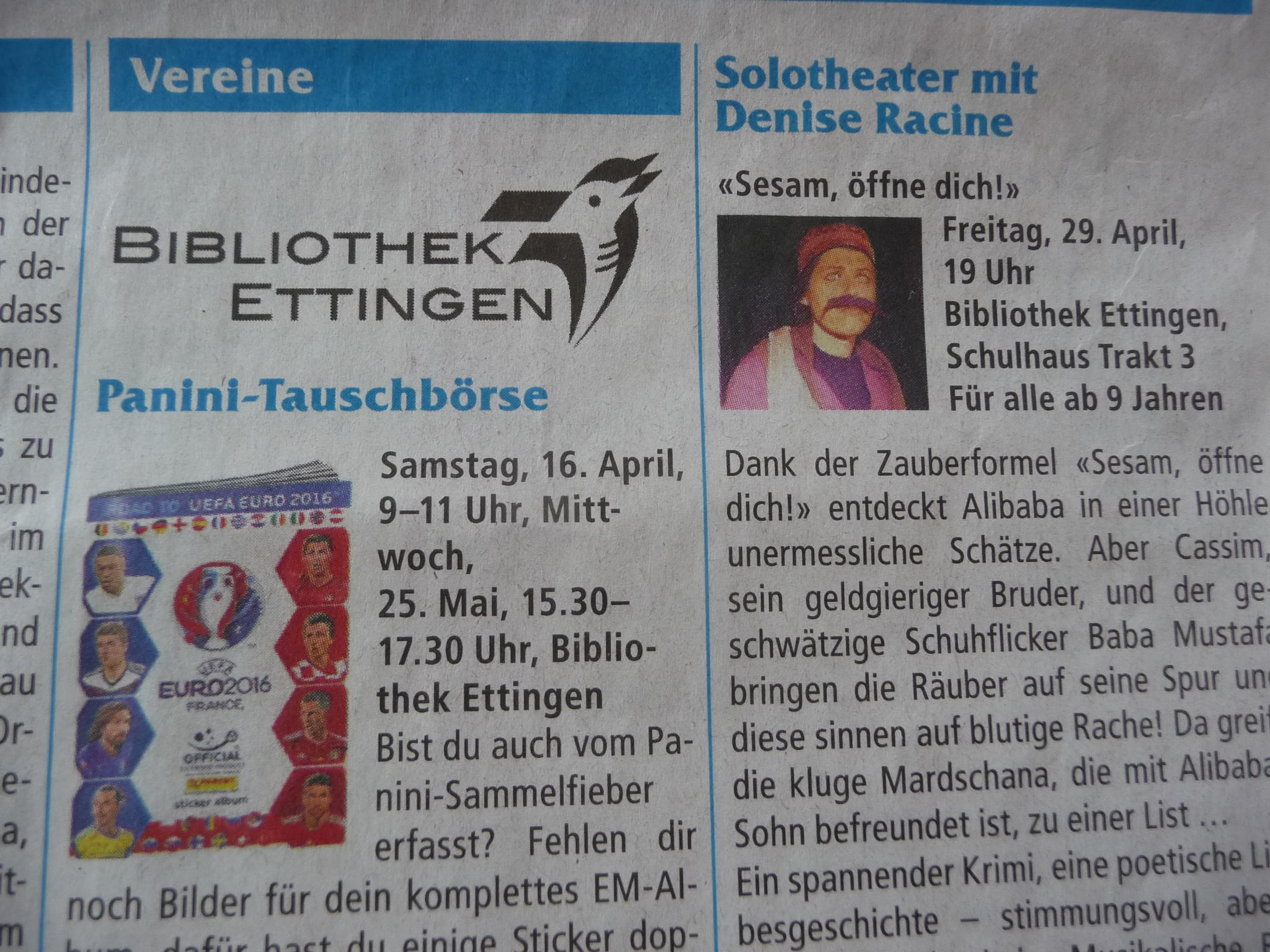 お役所の広報の次は、「フェアアインからのお知らせ」。このフェアアインとは、同じ趣味や目的で集まった者たちで作る、非営利のサークルのことである。ヨーデルクラブ、老人ウォーキングクラブ、失業者の集い、イタリア人のサッカークラブ等が、会員募集やイベントのお知らせを載せている。