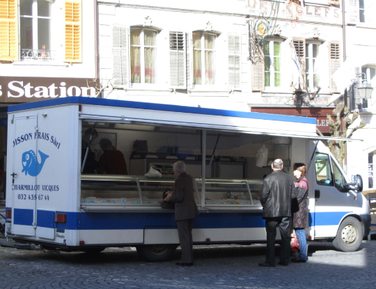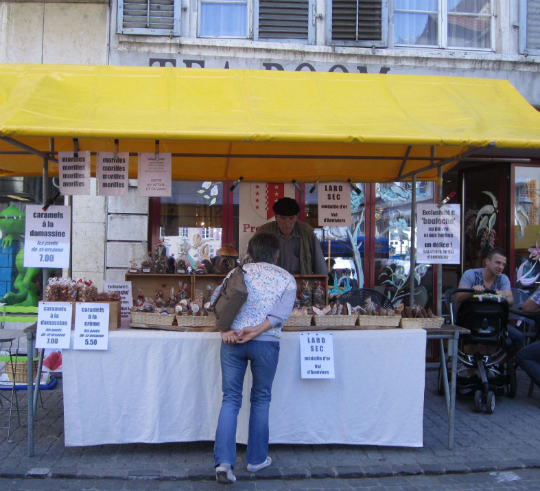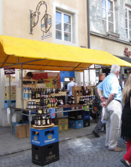 さて、かつて庶民の台所の供給源かつ交流の場ともなっていた市場はその後、どうなったのだろうか? スーパーマーケットの進出により、小売店は次々と廃業に追い込まれていったのは世界的にも避けがたい現象だったが、旧市街と市場を彩っていた屋台商人達にも苦戦が強いられるようになった。伝統的木曜市は現在も続いているが、寒い季節には出店者も客も少なく、通りは閑散として淋しい限りである。また、定期市は、1797年からは年六回、19世紀からは毎月第三月曜日に開かれていたが、木曜市と同じ運命をたどっていた。平日の市に人が来なくなったのは、家庭の台所を預かっていた女性が日中、仕事に出るようになったことも一因であろう。このような社会生活の変化は一家の収入を増やし、個人生活を豊かにしたかも知れないが、一方で、小さな町の活気の低下や商業の衰退を招きつつあった。古くからの住人の間にさえあきらめモードが漂いがちであったが、昨年、この状況を打開すべく、一人の男性が名乗り出た。