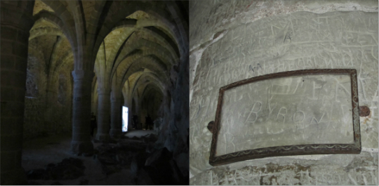2時間半かけてじっくり回ってみると、それぞれの部屋の機能性や細部の美しさに感嘆すると同時に、以前の訪問ではそれほど気にならなかった場所が、妙に印象に残った。まず、壁や回廊に開けられた様々な形の銃眼の数の多さ。この城が、いかに城砦として重要視されていたかを物語っている。また、昼時で観光客が少なかったせいか、牢獄、処刑場、拷問部屋などでは、背筋が凍りつくような感を覚えた。絵になる外観とは正反対に、ごつごつした自然の岩をそのまま使った地下牢は、照明が抑えられ、湖から這い上がってくる冷気と湿気が漂い、不気味でさえある。英国ロマン主義の詩人バイロン卿(Lord Byron)は1816年6月にこの牢獄を訪れてインスピレーションを受け、ここに1530年から6年間幽閉され鎖に繋がれていたジュネーヴの愛国者、フランソワ・ボニヴァール(François Bonivard)への思いを綴った「シヨンの囚人」という詩を発表している。バイロン卿の詩によってこの城は一躍有名になったが、ボニヴァールだけでなく、14世紀のユダヤ人大量虐殺、16~17世紀の魔女狩りで連行された者達の拷問と処刑、封建支配下では領主であるサヴォワ家やベルンへの反抗を企てた者達の投獄・処刑など、何百年にもわたって惨劇の舞台であり続けたことを忘れてはならない。