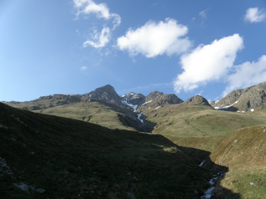 しばらくすると、谷の光景は変わってくる。あれほどたくさんあった樹木が突如として一本もなくなるのだ。それは標高が二千メートルを超えたということだ。二千メートルを超えると、もう樹木が育たなくなることを私はスイスに移住してはじめて知った。この谷の一番奥に現われるのが、年間を通して住民が暮らす村、ヨーロッパ最高地にある、ユーフ(Juf)、標高2126メートルである。遮るもののない草原に照らす太陽の光は眩しい。肌寒いはずなのに強い日差しの下にいるとすぐに暑くなる。