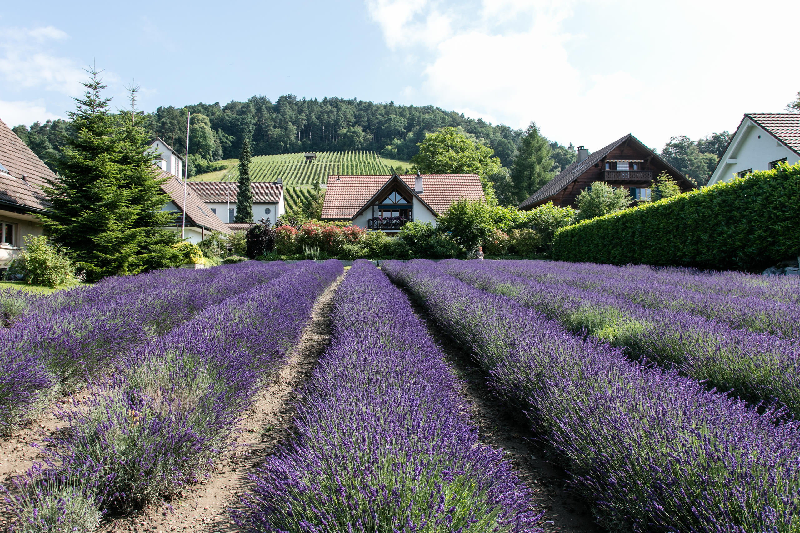 クラウディア・ドゥンマームスさんは長年の夢を実現した。チューリヒ州・オーバーシュタムハイムの住宅街でラベンダーの栽培を始めたのだ。畑は700平方メートルの広さがある。スイスインフォのカメラが、好天に恵まれた収穫の一日を追った。
