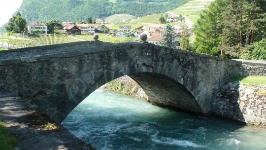 私の住むレザンの麓にエーグル(Aigle)という町があります。人口8,300人 (スイス政府観光局、2011年11月23日付)、美しい葡萄畑が広がりワイン造りが盛んです。また、古くから交通の要所として栄えた町でもあります。この町を流れるグランドー川(La Grande Eau)にナポレオン橋(Pont Napoléon)という、「1723年」と刻まれた石造りの橋が架かっています。