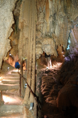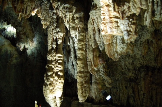 上部の洞窟では、天井から下に伸びた鍾乳石と床から上に成長した石筍(せきじゅん)が連結した石柱を見られるほか、スクリーンに見立てた壁に当てられたられた照明が水の音に合わせて色を変えるという視聴覚効果を狙った演出もあります。下部の洞窟にはいくつかの池があり、ワニや亀や蜂の巣の形をした大きな石などが見られます。ワニの写真を見るとお分かりになると思いますが、下の方がぶどうの粒のように丸くボコボコしていて、上の方はツルンとしています。これは、水面を隔てて水中と水上で石の形成のされ方が違うということだそうで、これには驚いてしまいました。