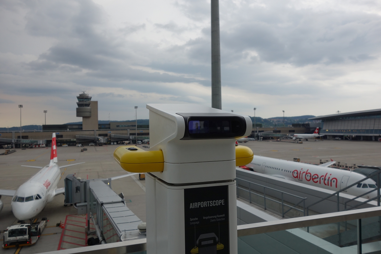 また、空港内で飛行機を眺めたい人はターミナル2に新しくできた見学者用テラスB(Zuschauerterrasse B)がオススメ。テラスへの入場前に出国の際と同じような荷物と着衣のX線チェックがあるので要注意。入場料金は大人5フラン、小人2フラン(10歳以下は無料)で、一見の価値は十分ある。広々としたテラスにはモダンなベンチが置かれ、お洒落な雰囲気。レストランや、家族向けにミニ飛行機が置かれた子供の遊び場もある。中でも是非試してもらいたいのは、テラスの4ヶ所に設置されたエアポートスコープと呼ばれるハイテク望遠鏡。スイスには珍しく無料で使え、ドックに停まっている飛行機に焦点をあわせてズームアップすると、覗き画面にその飛行機の詳しいデータがでる仕組みになっている。また、空港内の施設(管制塔や大気汚染観測所等)に焦点をあわせれば、その情報も読める。言語は英語とドイツ語で選択可能。大人でも十分楽しみながら空港の知識を身につけることができる。今後、空港を利用する際に時間があれば、是非見学者用テラスBに一度行ってみてほしい。