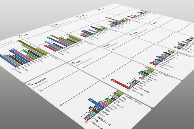 下のグラフは、国別、競技別に見た選手数の比率を表したものだ。リオ五輪では、4分の1以上の選手が団体競技選手であるにもかかわらず、グラフからは、スイスの団体競技出場者がゼロであることが分かる。