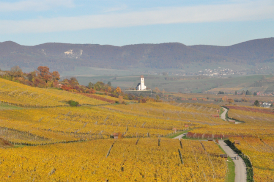 斜面に広がる葡萄畑。葉が黄金色に色づくとそろそろ新酒の季節。ボジョレー・ヌーボー解禁日(11月15日)まであと一週間。 swissinfo.ch