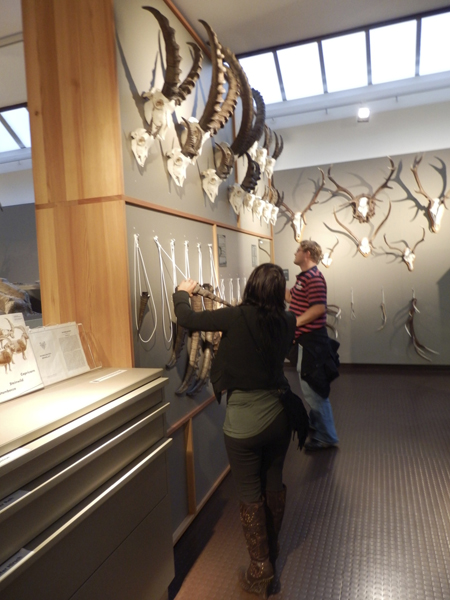 この博物館は規模としてはさほど大きくない。グラウビュンデン州で見られる動植物や鉱物を中心に展示されている。世界の自然の驚異や珍しい生きものではなく、身近な自然の事をよく知ってほしいというコンセプトのようだ。その分、展示方法に様々な工夫がされている。鹿や牛、山羊の仲間の頭蓋骨や角を展示したコーナーは触ってもいい事になっていて、その形状の違いや大きさを実感できるようになっている。野生植物を押し花にしたものを手に取ってみる事もできる。ただ見学するよりも体験したほうが印象に残る。こうした展示法は損壊のリスクも伴うのだが、私が見た限りどの展示品も綺麗な状態を保っていて、見る側のマナーのよさにも感心した。