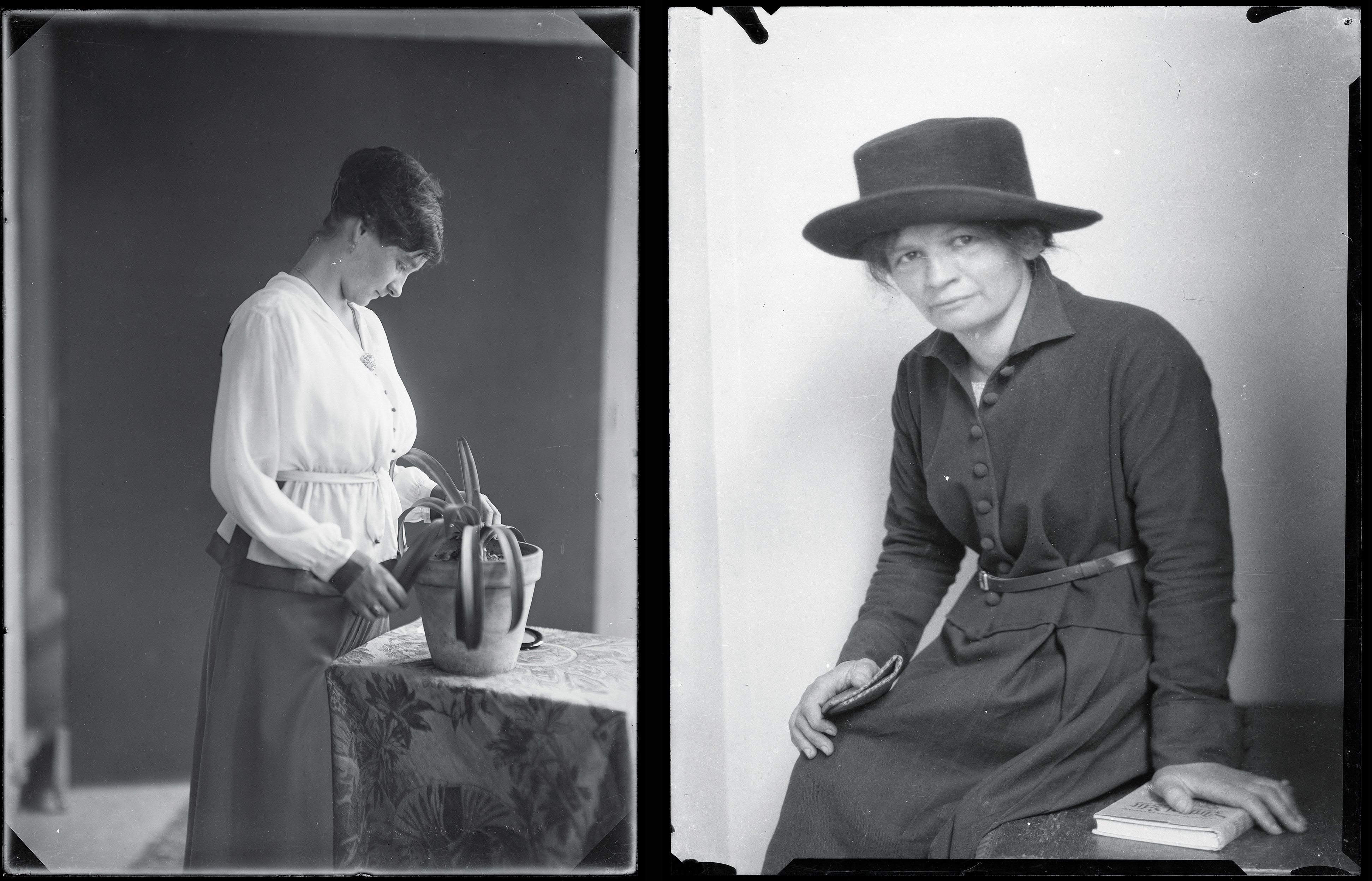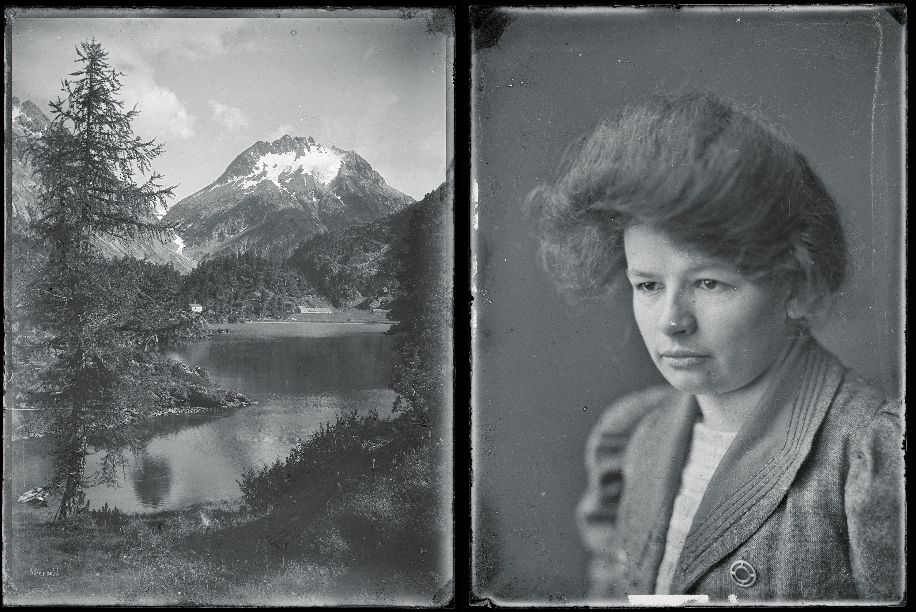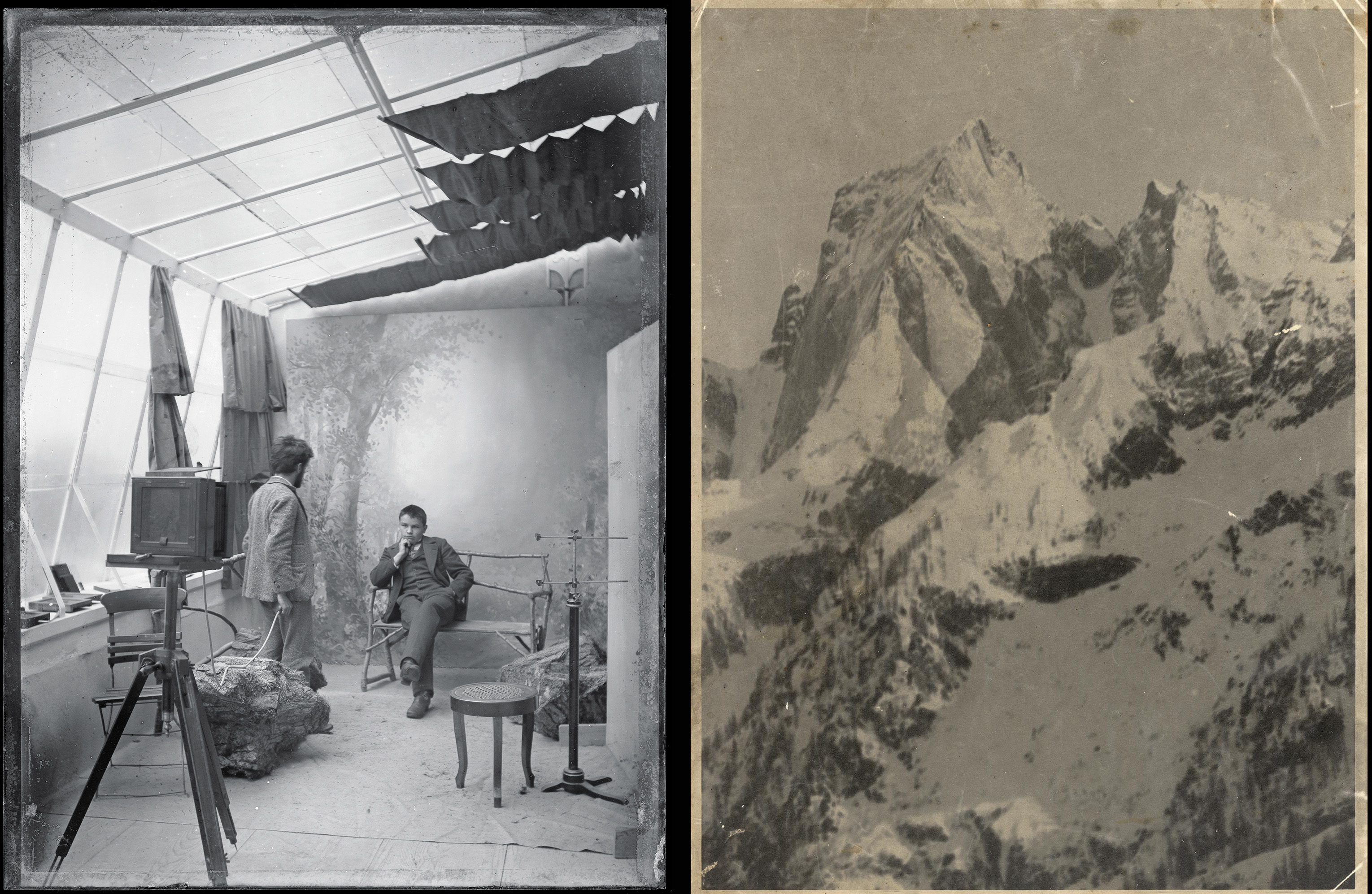 アンドレアとアウグスト・ガルバルド、自宅のスタジオにて(左)。ブレガリア谷の山々、1900年頃