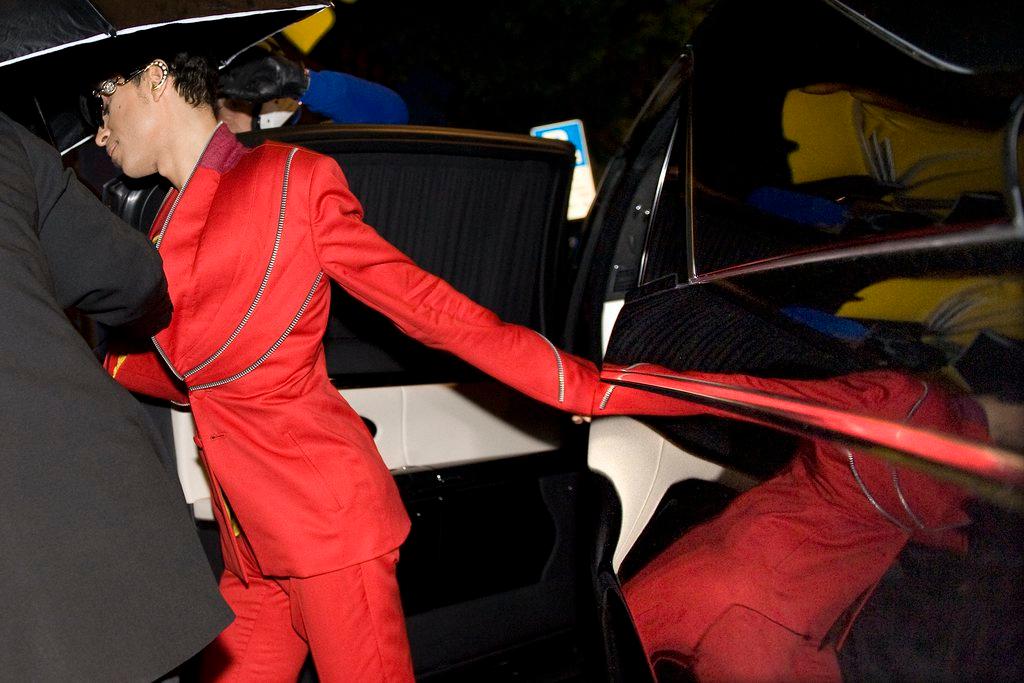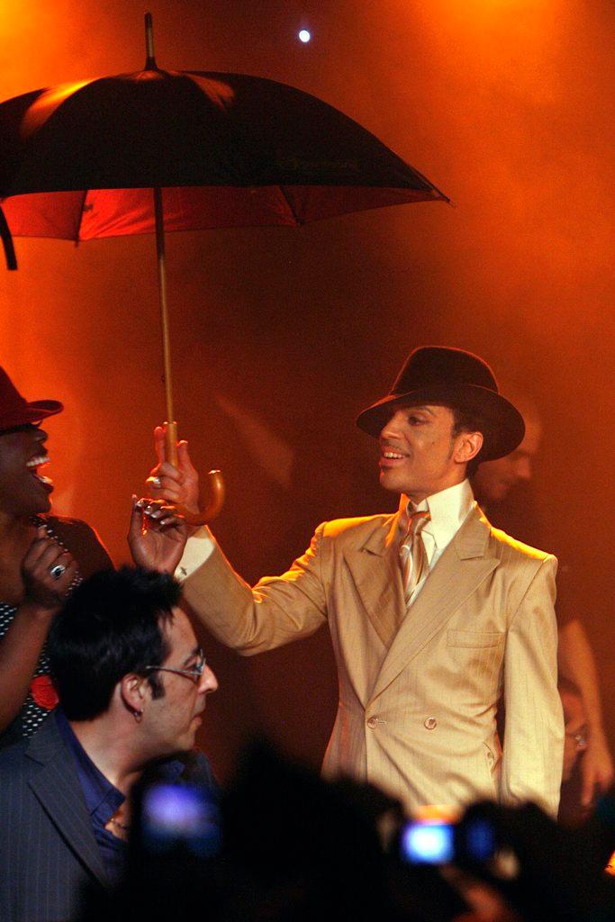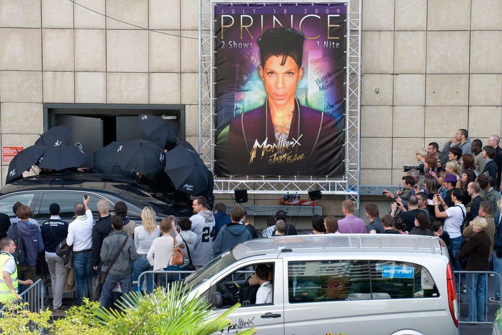 モントルー・ジャズ・フェスティバル2009。サウンドチェックを終えて出てくるプリンスさんを傘で隠すスタッフたち。コンサート中は撮影が禁止されていた