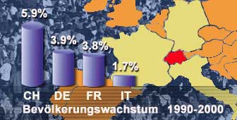 昨年行われた国勢調査の結果、1990年から2000年の10年間でスイスの総人口は728万人に到達し、10年前の調査よりも5.9%増えた。スイスの90年代の人口増加率は欧州最高だ。人口増加の原因としては、過去10年間では出生が死亡を200、000人上回ったことと、移民の増加の二つが上げられる。