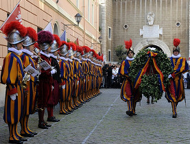 謁見 ( えっけん ) ホールに集まった新衛兵の32人は、ベネディクト16世とその後に続く法王に対し、忠実に、誠実に、そして立派に、また有事には命を懸けて仕えることを誓った。スイスからはジャン・フランソワ・カンマー大使とアンドレ・ブラットマン・スイス軍新総裁が出席したほか、今年はチューリヒ州政府のメンバーも賓客として招待された。