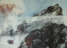 キャンバスに描かれている山々はおぼろげに重なり合い、大きな生き物に見える。近寄りがたく、神々しい感じさえする。そこを縦横に走る白くて薄い筋の空気が、登頂に挑む人間たちを吹き飛ばす強風に見える。吹き付ける風音は今にも聞こえてきそうだ。