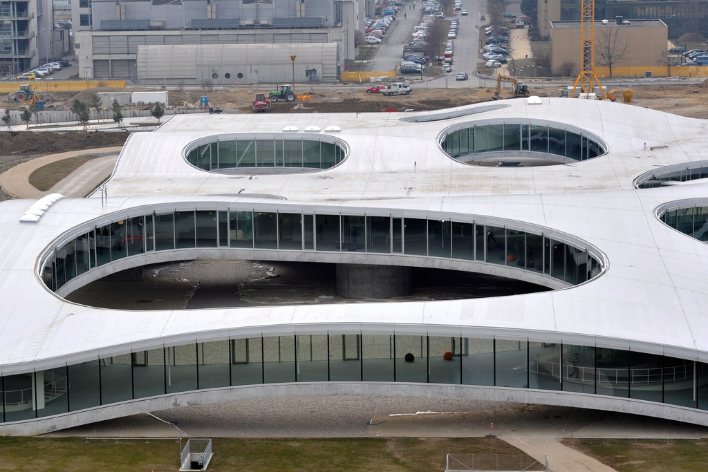 これは連邦工科大学ローザンヌ校キャンパスの「トーテム」であり「核」となるような多目的学習センターだ。今世界が注目する日本の建築家、妹島和世 ( せじまかずよ ) 氏と西沢立衛 ( にしざわ りゅうえ) 氏の共同建築事務所「SANAA」が設計した。