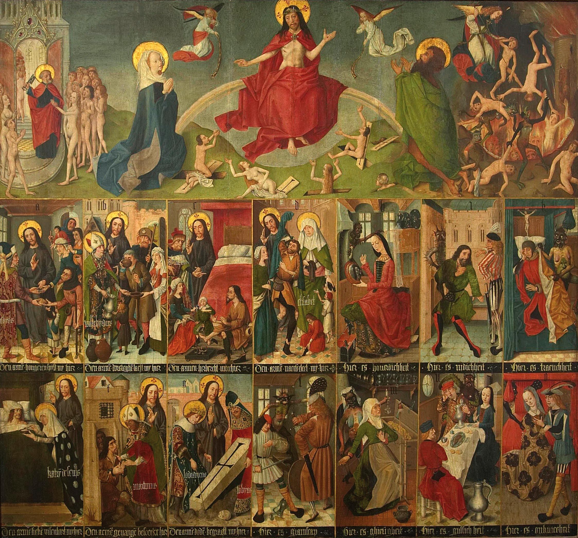 「最後の審判、七つの愛徳と七つの悪徳」、アントワープのマイスター作、11490年-1500年、木に油絵具、15x125 cm