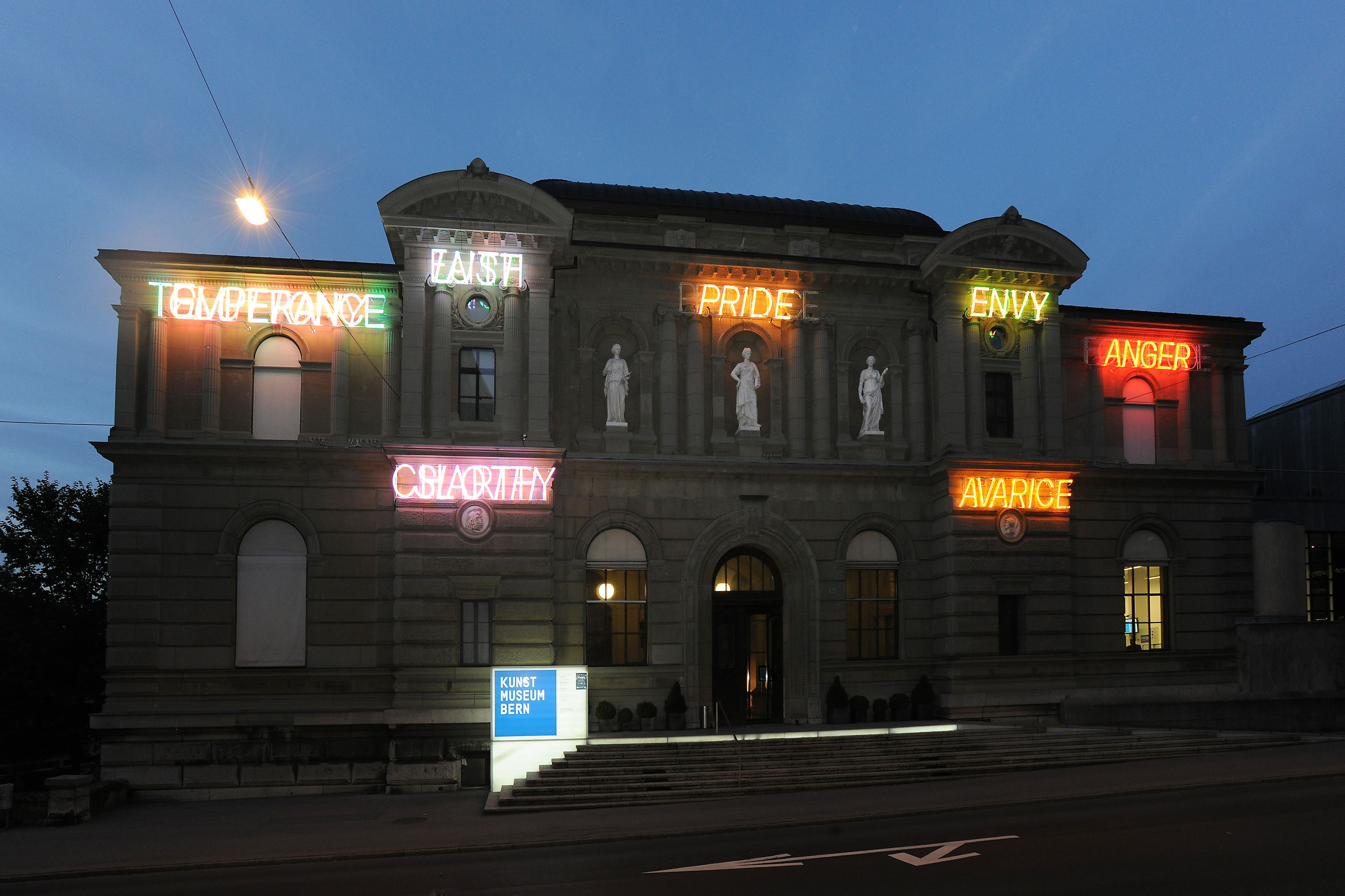 ベルン美術館の前面に七つの大罪をネオンの文字で飾るブルース・ナウマンの作品、2010年