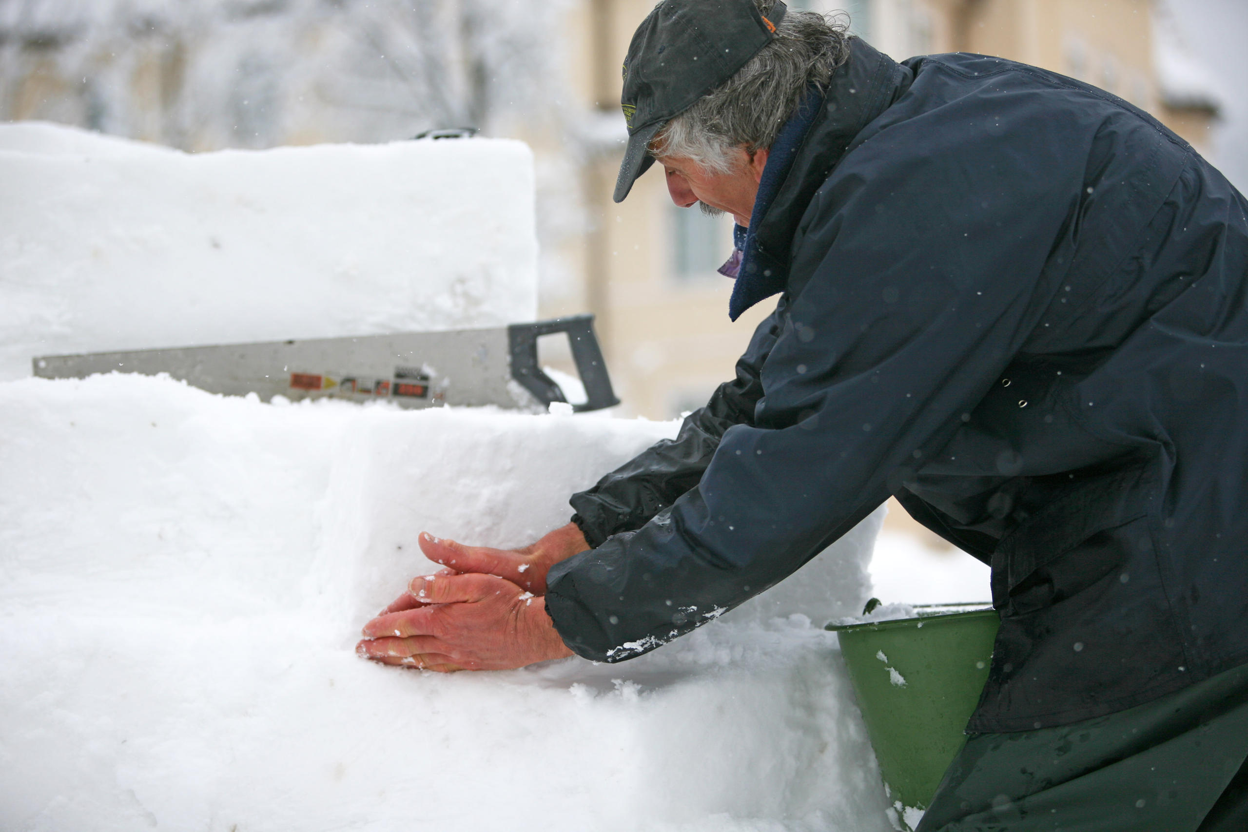 のこぎり、ノミ、シャベル、チェーンなど道具もいろいろ。グリンデルヴァルトで1月19日から24日まで、「一瞬」をテーマに雪像を作る人々を追う ( 写真と文 : swissinfo、クリストフ・バルジガー )