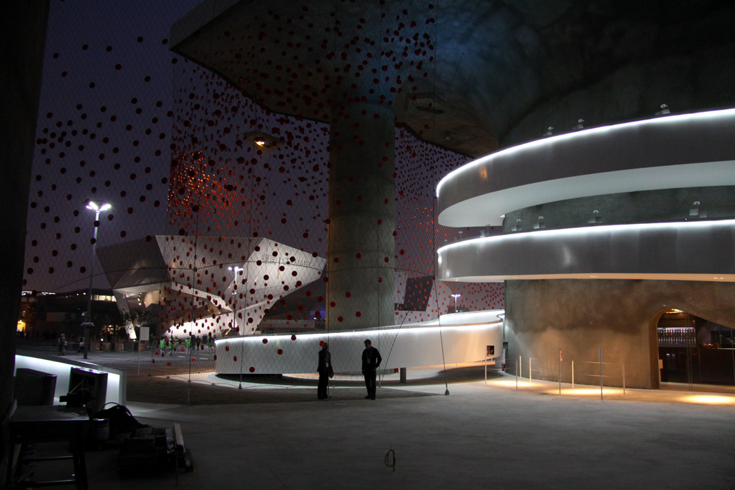 実際、スイス館はコンクリートの打ちっぱなしに、アルミの金属ワイヤーがすだれのように連なった金属カーテンが周囲を囲み、このカーテンには太陽電池と電球を含む赤い円形のプレートが1万1000個取り付けてある。