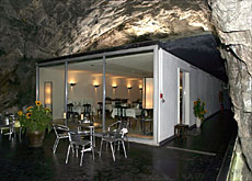 標高2,050メートルのゴッタルド峠の岩をくりぬいて作られた要塞を改築したのがこのホテルである。まず入り口は見つけ難い上、赤い入り口の前に立っても、「入りにくい。入りたいと思わない」というのが第一印象だろう。入ると200メートルのトンネルになっている。一歩一歩湿っぽくなり、気温が下がってゆくように思われるトンネルを通って行き着くところは、第二次世界対戦中に孤立したスイスが防衛に使った要塞で、1995年までは200人の兵隊がこの要塞で軍事訓練をしていた。