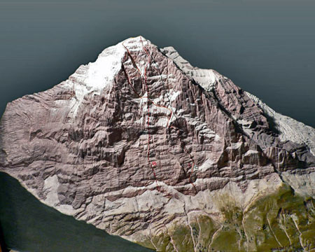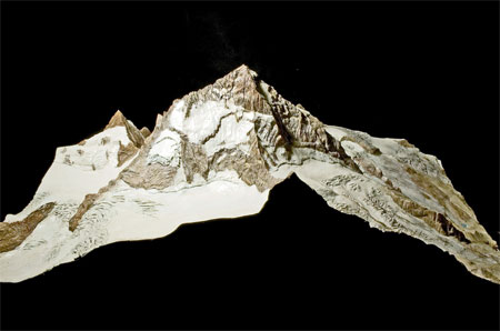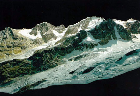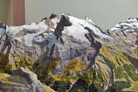トニー・マイヤー氏が作るレリーフ模型は、本物以上に本物に近い。模型を捕らえたカメラの角度で実際の山を撮影するには、航空写真に近いアングルになる。また、マイヤー氏の作品の季節は一番美しいという秋だ。比較した2枚の写真にこうした違いがあるものの、マイヤー氏のレリーフ模型の巧妙さが分かるギャラリーです。