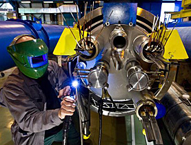 実は、これらのマグネットを繋ぐ、電流コイルのケーブル結線部の繋ぎ方がたった1カ所うまく行なわれていなかった。約8000ある結線部中のたった1つが原因だったというわけだ。陽子ビームが加速され、高エネルギーになった際、問題の部分で抵抗値が増加し、発熱して溶けたため穴が開き、冷却用の液体ヘリウムが流れ出した。しかも液体ヘリウムが気化する際の膨張の圧力がほかのマグネットを押し、マグネット間の接続がずれてしまった。