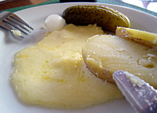 「サトノブ隊長、これってそのお・・こっそり言うとズバリ『観光客おいでおいで』レストランじゃありませんか。」「そ、そのようね・・」注文してみると、ピクルスとラクレット用の小さなジャガイモだけの超クラッシックなスタイル。は、はずしたかのう・・隊長 ?