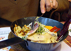 待つことしばし。フライパンに入ったレーシュティ愛らしく登場。ちゃあんとスイスの旗も立ってる。うれしいぢゃないの。