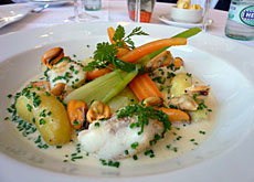 メニュー : 前菜にアンディーブのサラダ17フラン ( 約1700円 ) 、グリンピースのスープ11フラン ( 約1100円 ) 、メインにムール貝とアンコウの煮込み42フラン( 約4200円 ) 、キノコと牛の尻尾肉が混ざった添え物の牛ステーキ45フラン ( 約4500円 ) 、以上は1品を選ぶアラカルトで、季節ごとに変わる。もう1つのセットメニューは週変わりで、前菜、メイン、デザートで1人46フラン( 約4600円 )