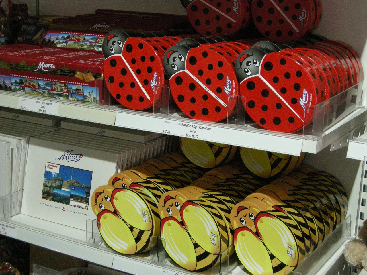 見学コースの映画の前にもらったチョコを食べてみると…、普通のスイスのチョコとちがう 随分とマイルドで不思議な味。カカオ、あまり使っていないかも…。ガイドさんの説明によると、甘味は砂糖大根の砂糖を使っているそうだ。ふーん、スイスのチョコはみんなそうなのかしらん。