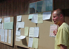 一方で、たとえば乳絞りの衛生管理では、小屋の清掃に使う洗剤の量がグラム単位で決められているのは「無駄な規則」とみる。細かいことまで決められているためすべてを頭では覚えられない。規制に関する書類を壁に貼っているヴィース氏。貼られた紙の長さは並べると2メートルにもなる。