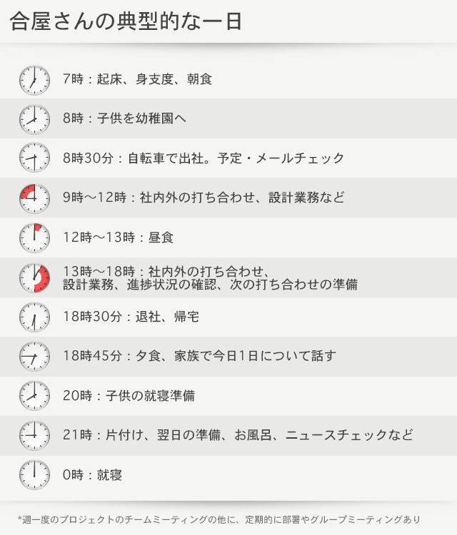 スイスで合屋さんは朝7時に起床。出社時間はフレキシブルだが、子供を幼稚園に送るため8時には家を出る。会社はプロジェクト予算を無視した「残業」や、上司が決定を下すまでの「無駄な待ち時間」を敬遠する。「もし勤務時間内に7時間の『空き』が発生すれば、上司部下関係なく家に帰って休憩し、会社もそのように求める。対して日本では上司のことを待つ部下が多い」